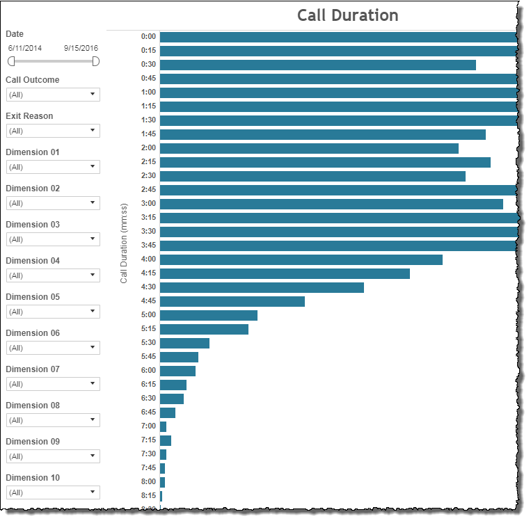 Increase the specificity of your report by applying filters to the data. The Call Duration report's filters include Date, Session Outcome, and Exit Reason. Additionally, the report may include one or more other customized filters depending on what has been configured specifically for your system.