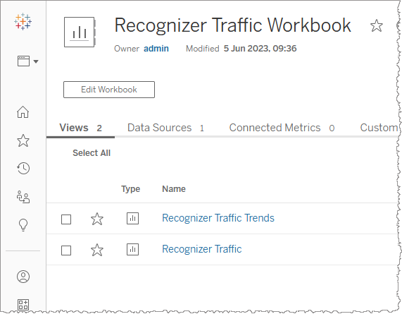 The views in the Recognizer Traffic workbook give high-level visualizations of Recognizer traffic metrics, including session volume and duration, agent transfers, and traffic trends. The Recognizer Traffic workbook page lists all Recognizer traffic reports.