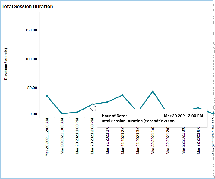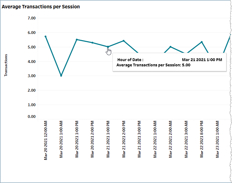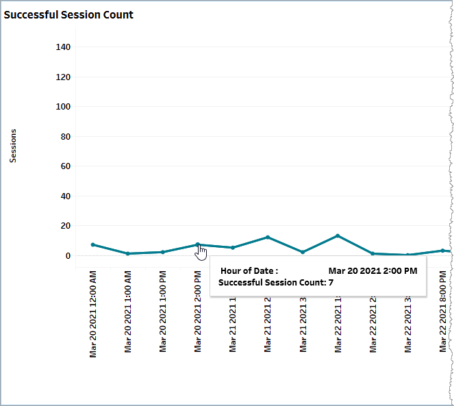 In the example, below, there were 7 error-free sessions for the hour starting on March 20th, 2021 at 2:00PM. The entire graph displays all data for the neap260)mixct_testdata_appid1 application (appid filter setting not shown) from March 20th, 2021 to March 25th, 2021 (Date slider setting not shown). This is a raw metric (succ_session_count).