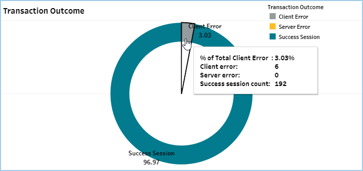 This donut chart visualizes the proportional distribution of transaction outcomes, broadly split out into successful and errored outcomes. Errored outcomes are sub-categorized as being Client Errors or Server Errors. Mouse over any part of the chart for a tooltip with relevant information.