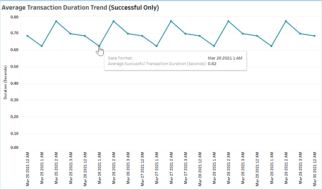 This graph plots the change over time in the average duration of successful transactions for consecutive blocks of time.