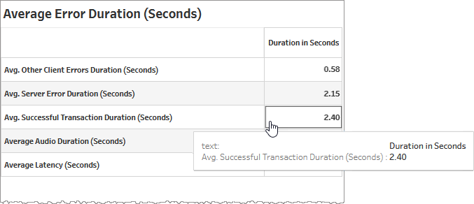 This table lists average durations in seconds of client and server errors, respectively. The table also lists the average durations of successful transactions, audio, and latency.