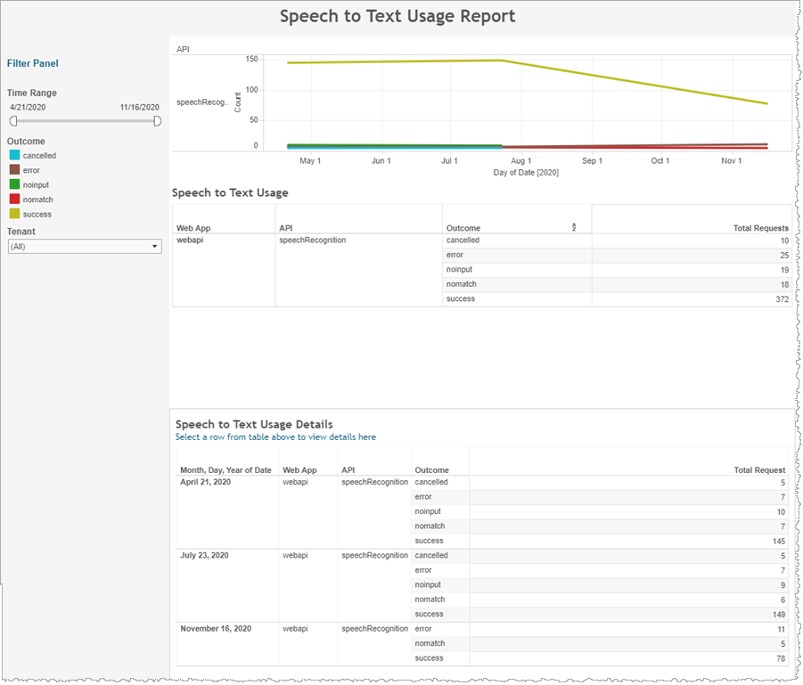 The Speech-to-Text Usage report shows the number of requests and corresponding outcomes for each speech recognition request in each application for the selected range of dates.