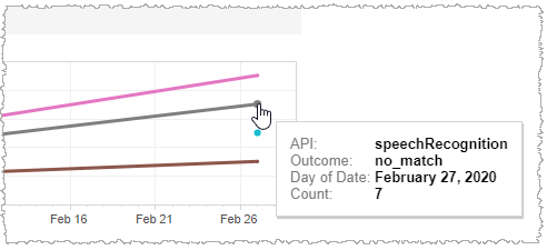 The graph represents request numbers for speech recognition trending over time, broken out by outcome. The Summary table immediately following the histogram is a 1:1 tabular representation of the same data, on a per outcome basis. The Details table at the bottom of the page draws from the same data set but groups the information by date stamp.