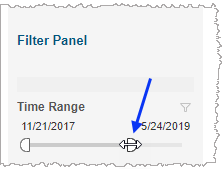 The Time Range slider allows you to narrow or expand the date range. The data displayed in all visualizations automatically reflect the subset of information falling within the selected range.
