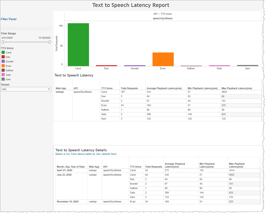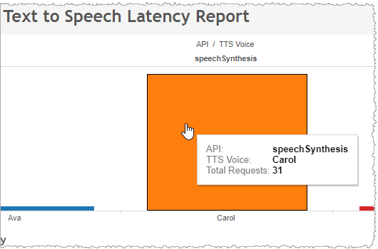 The Text-to-Speech Latency report shows response times for speech synthesis requests over the selected period of time. Latency is measured as the time from receipt of the playback request at the API server to the time when the server delivers the initial packet of audio back to the calling application.