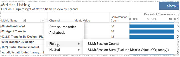 You can sort the Metric Name by using Data source order sort or Alphabetic sort. Sum of Session court or sum of Session sum (Exclude Metric value LOD) (copy) sorting is used to sort across all values of Metric Name or within it.