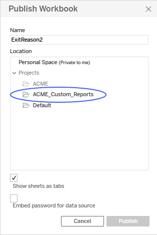 Note: When you create custom content, you can only publish it to a workbook in a custom project and not the original workbook in the original project.