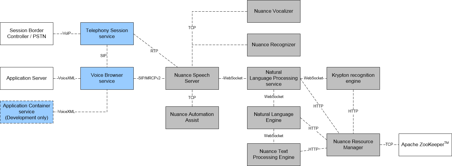 In the following diagram, the standard Nuance speech products, including Dragon Voice engines and supporting components, such as the Natural Language Processing service and Nuance Resource Manager, are gray. The Voice Platform components are blue. See the Speech Suite documentation for detailed information about each component.