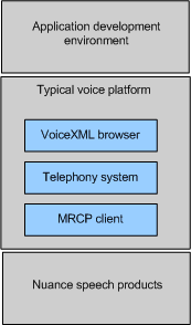 - MRCP client: Communicates with Nuance Speech Server and other speech products. It manages speech sessions through Speech Server, receives application requests from the browser, translates requests into standard MRCP messages, and returns results to the application through the voice browser. Nuance provides a sample MRCP client, and the voice platform must provide a working instance.