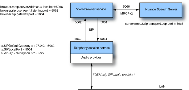 Voice Platform components use SIP internally to communicate with each other when processing an inbound call. This illustration shows the default ports, the service properties specified, and services they’re set on. These ports are reserved by Voice Platform regardless of the audio provider you’re using. The one exception is port 5060, set by audio.sip.UserAgentPort on the Telephony Session service. This setting is specific to the SIP audio provider.