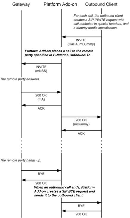 - When a connected outbound call ends because the remote party hung-up or because the Voice Platform application ended, Voice Platform sends a BYE request to the outbound client. The outbound client then sends a 200 OK response to Voice Platform to acknowledge the BYE.