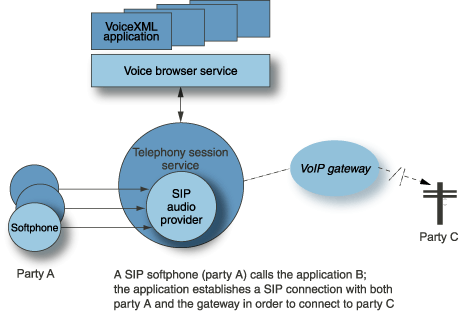 In the following figure, the original call comes in from party A. The SIP audio provider sends an INVITE to the called party, C. Once a response is received from the called party, the audio is streamed between the two parties, and between the application and each party, as shown in the diagram.