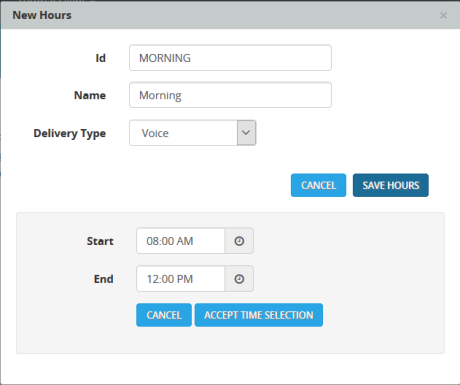 - Enter the ID, Name, and Delivery Type (Email, Sms, or Voice). Then select the Start and End times for the window. Here is an example showing that the hours from 8:00 AM to 12:00 PM have been selected: