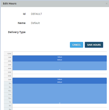 - The Edit Hours dialog opens. Select the Start and End times for each window as needed. Here is an example with two windows: