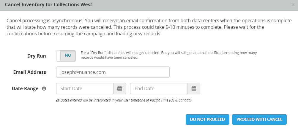 If you want to know in advance how many records will be canceled by the operation, set the Dry Run option to Yes before clicking Proceed with Cancel. You receive an email notification stating how many records would have been canceled, but no records will actually be canceled.