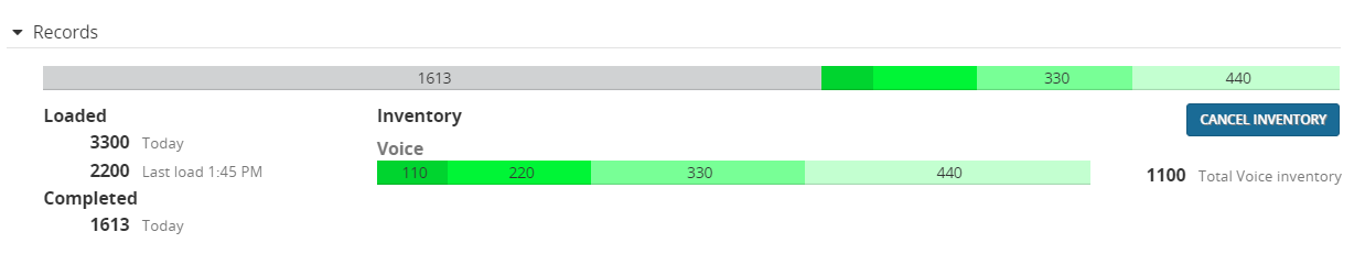 - Click Records. This expands the Records panel, showing details about records completed and scheduled for that campaign. If the Cancel Inventory button is disabled, it means that the campaign has not been suspended. For more information, see Cancel records in inventory. For example: