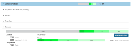 - Locate a campaign and click anywhere on it. This displays the panels for Suspend / Resume Dispatching, Results, Transfers, and Records.