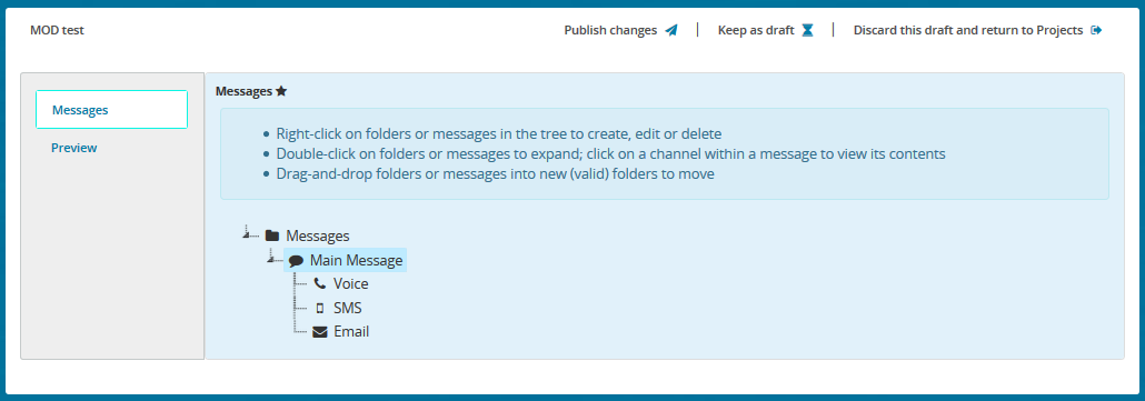 - To edit the contents of a message channel, click the message and then click the channel (Voice, SMS, or Email) you want to edit. This displays the contents of the message. Click EDIT to open the Message Editor. For details about the Message Editor, see Create and edit message content (MOD projects only).