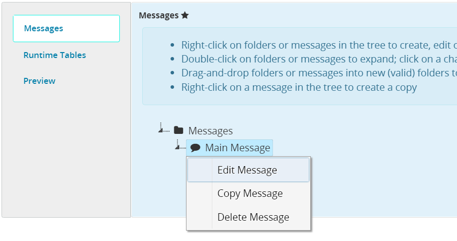 You manage messages in a project in the Message Tree, which is a hierarchical view of the folders and messages.