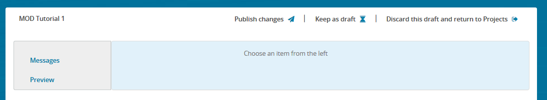 | Publish changes | Publishes the current draft so it will be available for use. Draft versions are not available for use. | Publish a draft project (MOD projects only) |