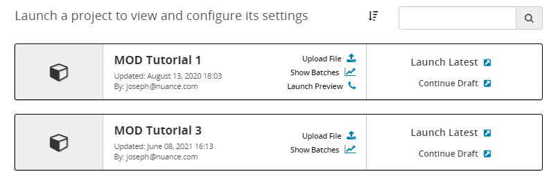 The following example shows two projects, MOD Tutorial 1 and MOD Tutorial 3.