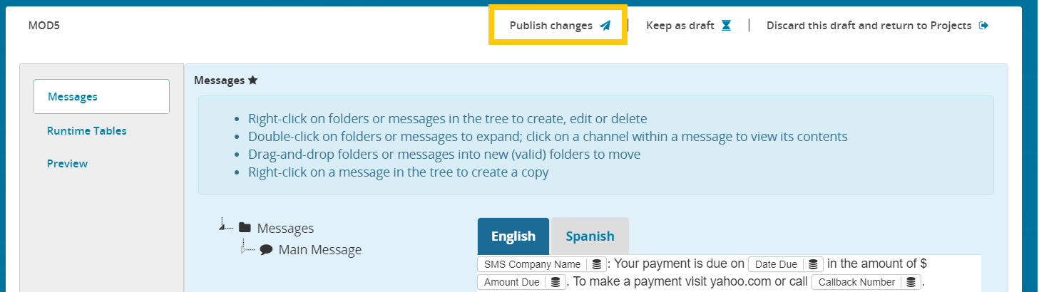 After you create and edit messages in your project so that they are ready to send to consumers, you should save your project version. This is called publishing the project version. Publishing makes the messages available to use in production.