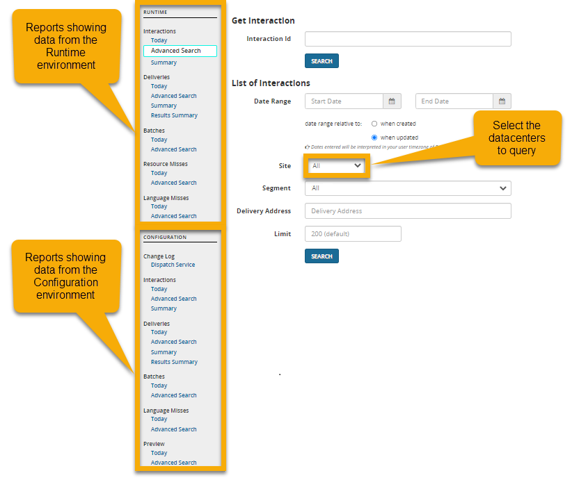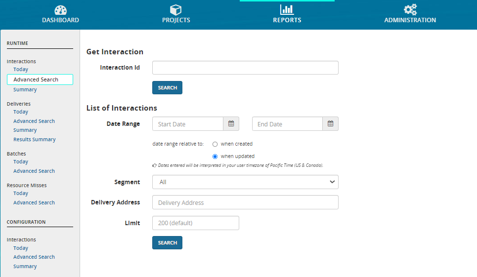 To open the Reports tab, click REPORTS on the top menu bar. By default this opens the Advanced Search form for Interaction reports: