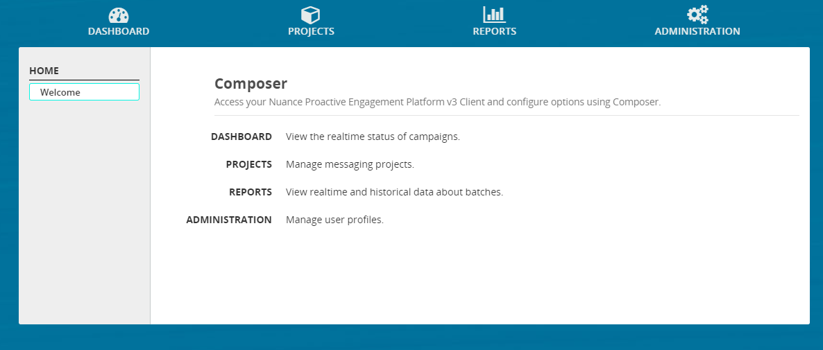 When you log into Composer, the Welcome page opens. The following tabs are available from this page: