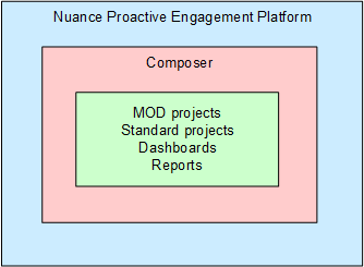 Composer is a web-based application that runs on the Nuance Proactive Engagement Platform. Within Composer, you can work with both MOD projects and standard projects. The relationship between Nuance Proactive Engagement Platform, Composer, and projects is summarized here: