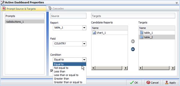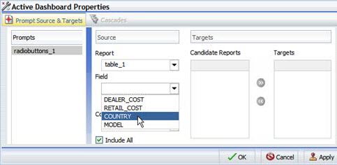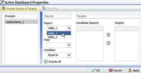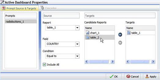 - From the Active Dashboard Properties dialog, select the reports from the Candidate Reports list box that to add as target reports.