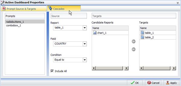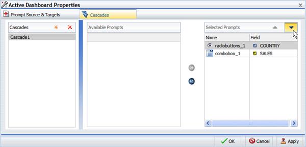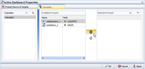 By default, a cascade named Cascade1 displays in the Cascades section of the Active Dashboard Properties dialog.