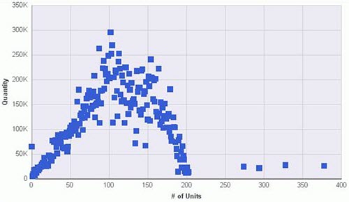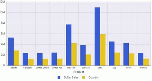 Scatter charts share many of the characteristics of basic line charts. Plot data using variable scales on both axes. When you use a scatter chart, the data is plotted with a basic line pattern so that you can visualize the density of individual data values around particular points, or discern patterns in the data. A numeric X-axis, or sort field, always yields a scatter chart by default.