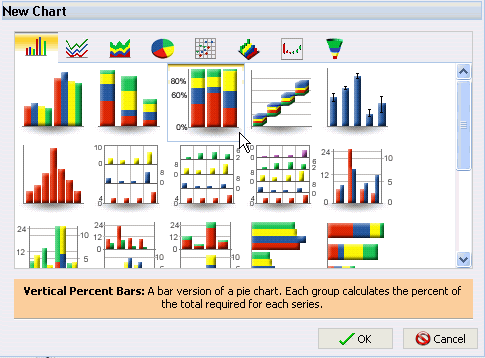 When a tab is selected, thumbnail images of the chart variations are displayed. In this example, the Vertical Percent Bar Chart type is selected. A description of the selected chart type is provided beneath the images.