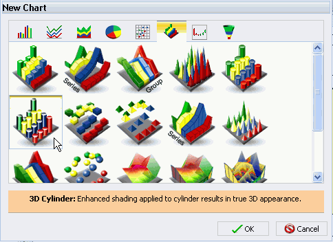 In the following example, the 3D tab is selected (the third tab from the right). Underneath the tab, the 3D chart types supported by Report Creator are displayed as images. Within the images, the 3D Cylinder chart type is selected, and a description is displayed underneath.