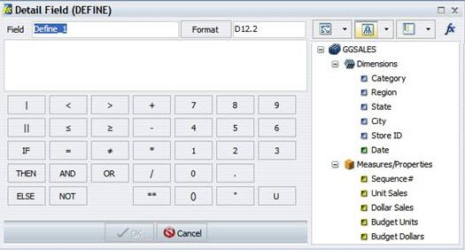 - Detail Field opens the DEFINE Field dialog. You can create a defined field, give it a name , and enter a format. A DEFINE field is added to the actual data. A DEFINE column is: