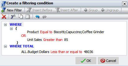 Advanced Filter options include the ability to use WHERE and WHERE TOTAL, in addition to enabling AND, as well as OR, conjunctions in a single expression. You can also group conditions, expressions, and apply functions or calculations within criteria. (This option provides more functionality than the Simple Filter. )