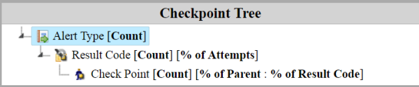 As you can see, the Alert Type is the root, the Result Code is the child node, and the Checkpoint is the child of the Result Code. The report displays an attempt count for all nodes. For result codes, both an attempt count and a percentage is displayed. For checkpoint nodes, an attempt count is shown, along with two percentages: the percentage of parent attempts that reached this checkpoint and the percentage of result code attempts that reached this checkpoint.