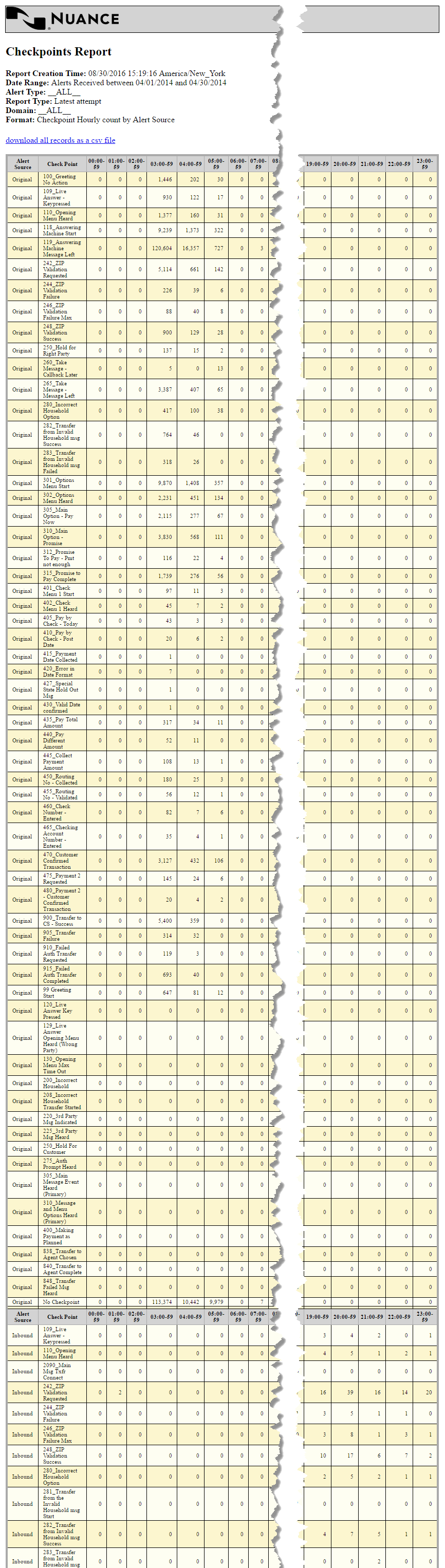 Shows result distribution, such as live answer, answering machine, busy signal, cancelled dispatches, and others, for each final checkpoint in the template. Indicates where customers exited the calls based on the type of call (result count). Also breaks out results by alert source, so it is possible to compare results by final checkpoint for outbound calls against results by checkpoint for inbound calls (that is, message retrievals). Suggested Use: Good for gaining insight as to opportunities in the template for further tuning. For details, see Checkpoint Result count by Alert Source, below. |
