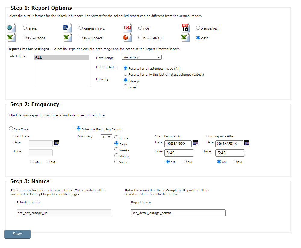 Step 3: Names: For Schedule Name, enter a name for these schedule settings to be saved as. For Report Name, enter a name for the completed reports to be saved as.