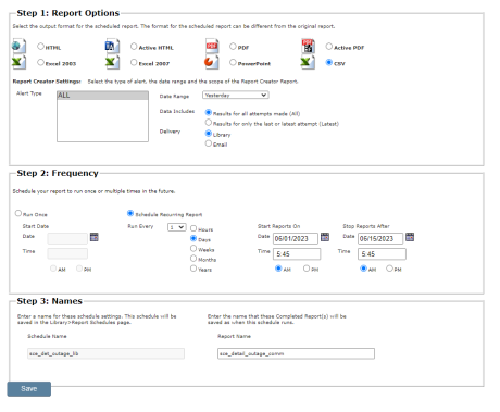 Step 1: Report Options: Select the output format for the scheduled report. The format for the scheduled report can be different from the original report. Then select the Date Range and choose options for Data Includes and Delivery. If you select Library, the reports appear under the Completed Reports tab.
