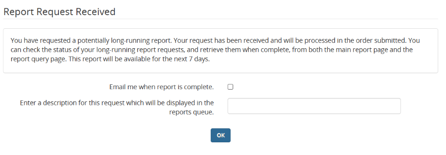 - Enter a description of the report. If you have multiple pending long-running reports, adding a description to indicate the type of report will help you identify this particular report.