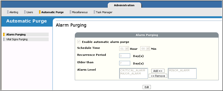To configure automatic alarm purge, display the Alarm Purging page, available from Administration→Automatic Purge. For example: