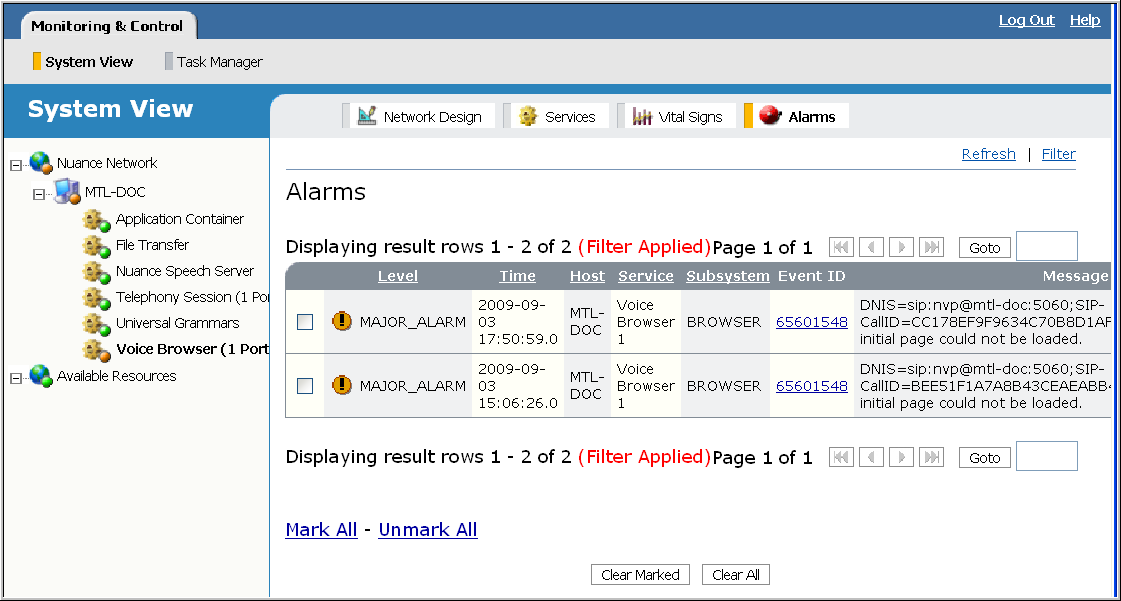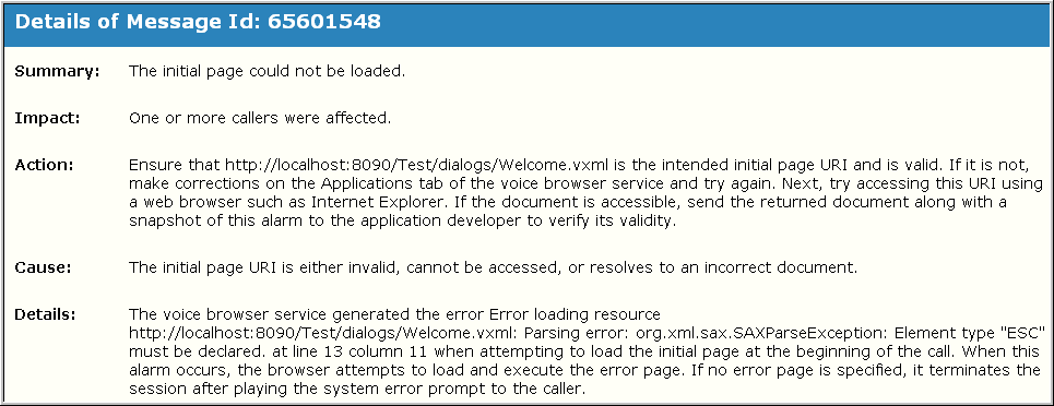 Timestamp=2009-09-01 16:58:59.720|Added Alarm :: Level=MAJOR_ALARM|Host=MTL-DOC|Service=Voice Browser 1|Subsystem=BROWSER...Message Text=...The initial page could not...