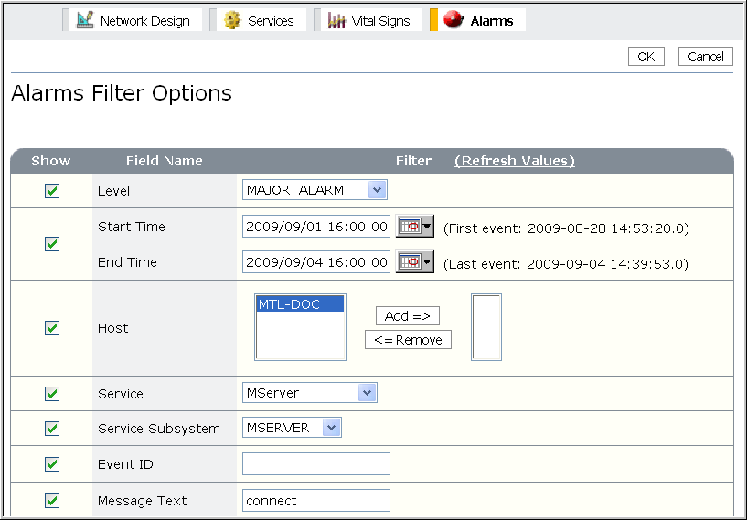 For example, to see all alarms containing the substring connect as part of the message text, type connect in the Message Text field. Management Station returns all occurrences of that substring, for example: Failed to connect, ERROR_CODE_CONNECTION_FAILED, and so on.