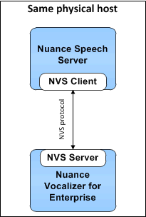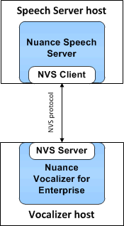 In the simplest configuration, the Vocalizer client incorporated in the Speech Server communicates directly with Vocalizer via the NVS protocol. Vocalizer then communicates to Nuance Vocalizer for Enterprise to perform the request, and sends back the results.